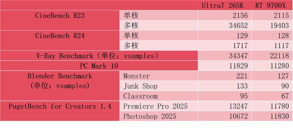 从测试数据来看,265K 是一把干活好手。在多核生产力场景中,它几乎全面领先:CineBench R23 多核性能高出 78.6%,Blender 三项渲染测试平均领先超 54%,V-Ray 渲染快 55.3%,Premiere Pro 导出效率提升 12.5%。即便在综合办公测试中,也以 4.9% 的优势略胜一筹。唯一例外是 Photoshop,9700X 小幅领先,但这并不影响 265K 在整体生产力领域的统治级表现。